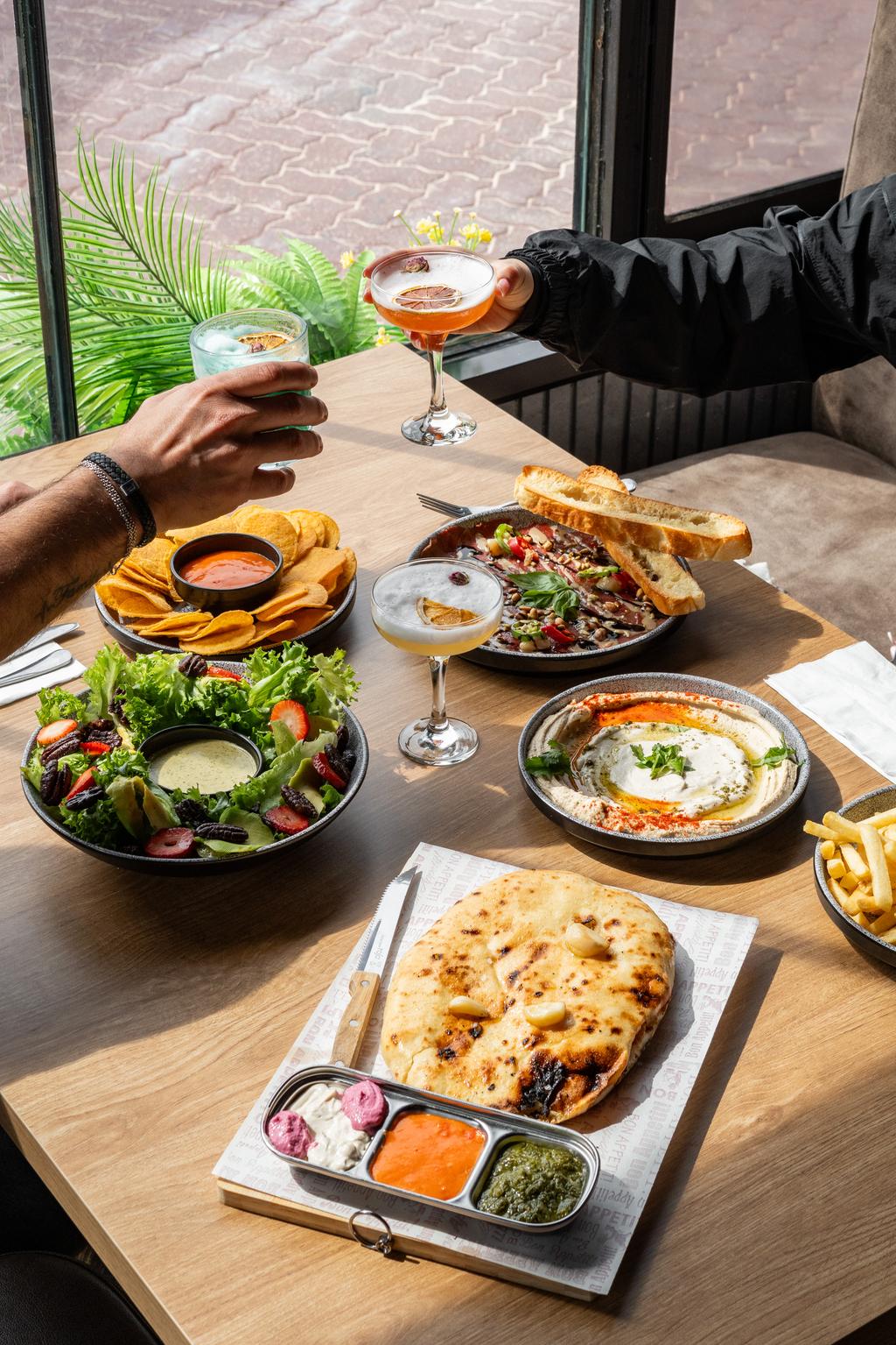 מטבוחה, חציל מטוגן, פלפל חריף וכרוב סגול במיונז